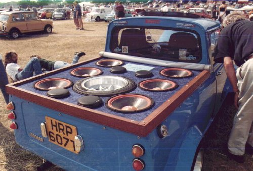 Auf den Minitreffen in England finden sich nicht nur kräftige Engländer sondern häufig auch kräftige Bässe. Leider fehlte diesem Bassmobilpickup die Möglichkeit, die Ladefläche schräg zu stellen, denn dann würde die 1000W Stereoanlage noch für zusätzlichen Vortrieb sorgen. Aber was macht man, wenn es regnet ? |
